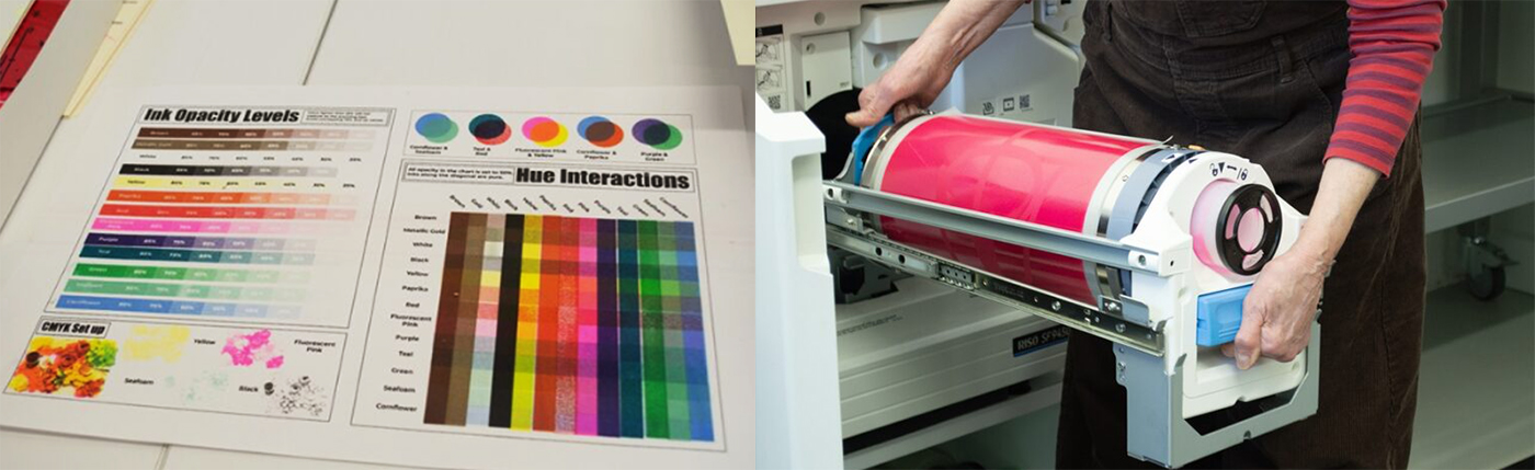 Photo: (left) This chart details the ways that the risograph inks can be combined and layered to create more colors. (right) Vicky Tomayko loads a fluorescent pink ink drum into the risograph machine. (Photos by Antonia DaSilva)